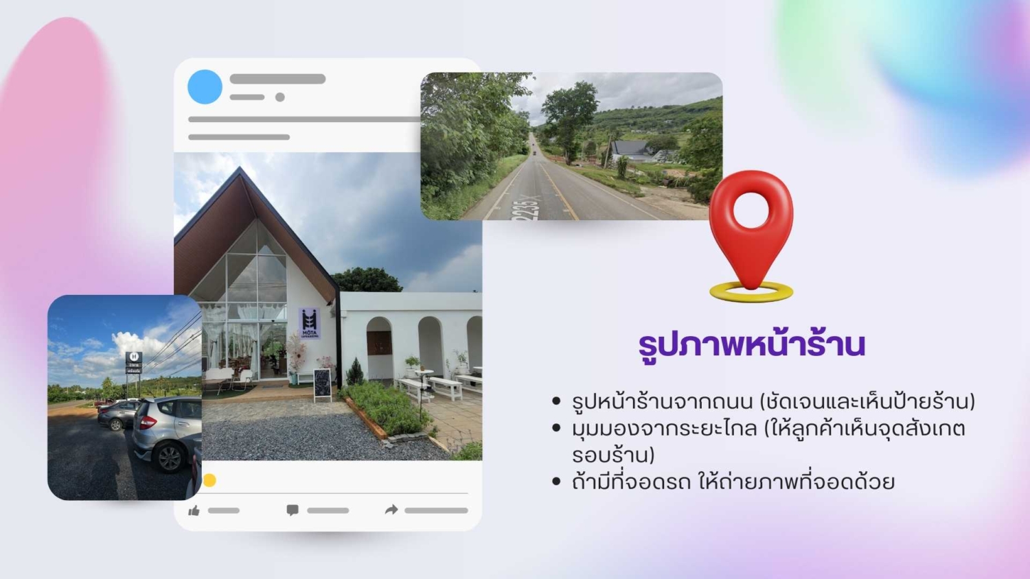 ความสำคัญ: เป็นภาพที่ช่วยให้ลูกค้ารู้ว่าร้านของคุณตั้งอยู่ที่ใด มีจุดสังเกตอะไรบ้าง และควรเดินเข้าทางไหน โดยเฉพาะอย่างยิ่งสำหรับลูกค้าที่ขับรถในเมืองใหญ่ เช่น กรุงเทพมหานคร การมีภาพหน้าร้านและเส้นทางก่อนถึงร้านถือว่าสำคัญมาก เพราะหากลูกค้าขับเลยร้านไปแล้ว อาจหาทางกลับมาได้ยาก หรือเสียเวลามากจนทำให้เปลี่ยนใจไม่มาใช้บริการ รูปภาพเหล่านี้จึงเป็นตัวช่วยที่สำคัญในการลดโอกาสในการพลาด และเพิ่มโอกาสที่ลูกค้าจะมาถึงร้านอย่างราบรื่น