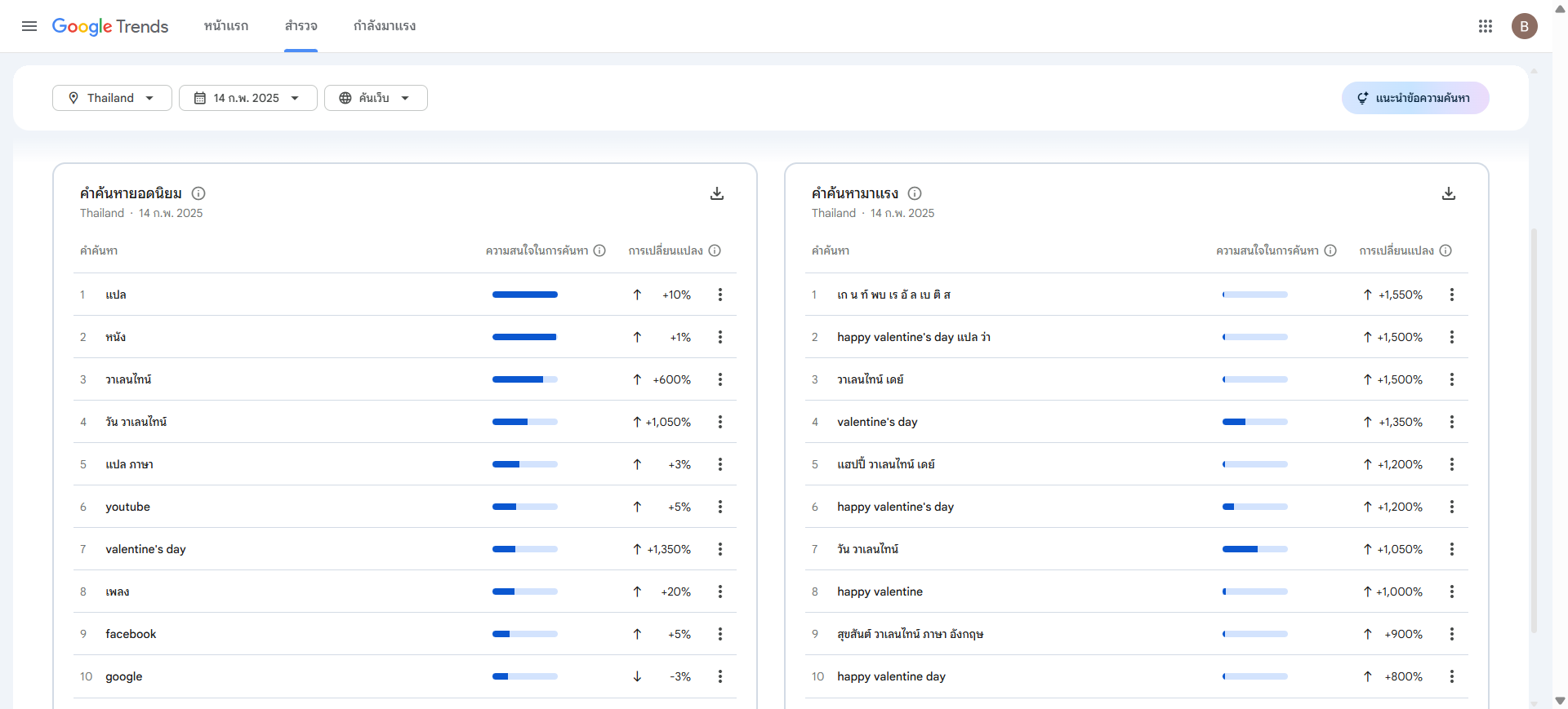 หากดูที่เปอร์เซ็นต์การเติบโต คำว่า “วัน วาเลนไทน์” มีการค้นหาเพิ่มขึ้นถึง +1,050% ซึ่งไม่ใช่เรื่องแปลกสำหรับวันสำคัญเช่นนี้ แต่ที่น่าสนใจคือคำเฉพาะเจาะจงอย่าง “เก น ท์ พบ เร อัล เบ ติ ส” (Getafe vs Real Betis) ที่โผล่มาเป็นอันดับ 1 ในหมวดมาแรง (+1,550%) ซึ่งอาจสื่อได้ว่า นอกจากความรักแล้ว แฟนบอลชาวไทยก็ยังเหนียวแน่นกับการลุ้นผลกีฬาไม่แพ้กัน!